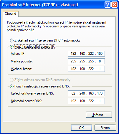 - Obrázek nastavení IP adres v PC v lokální síti:
